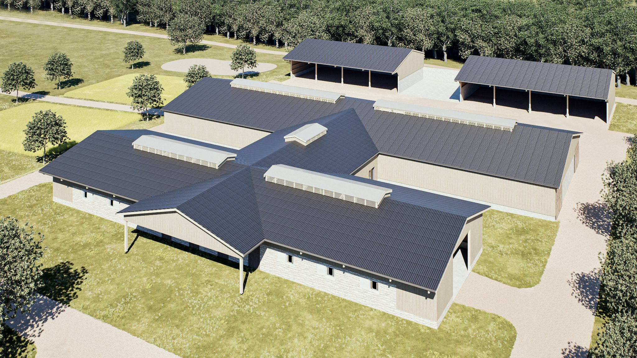 Création d’un complexe équin complet. Le projet comprend un barn principal et des bâtiments de stockage du fourrage et du matériel, associés à une fumière ouverte. Les constructions associent charpente bois, murs en béton et bardage bois naturel. Les toitures en bac acier gris graphite, ponctuées de faîtages translucides, assurent un éclairage naturel des espaces et intègrent des panneaux photovoltaïques dédiés à l’autoconsommation du site. Certains volumes sont traités en plaques fibro-ciment de teinte sombre, renforçant l’unité architecturale de l’ensemble.